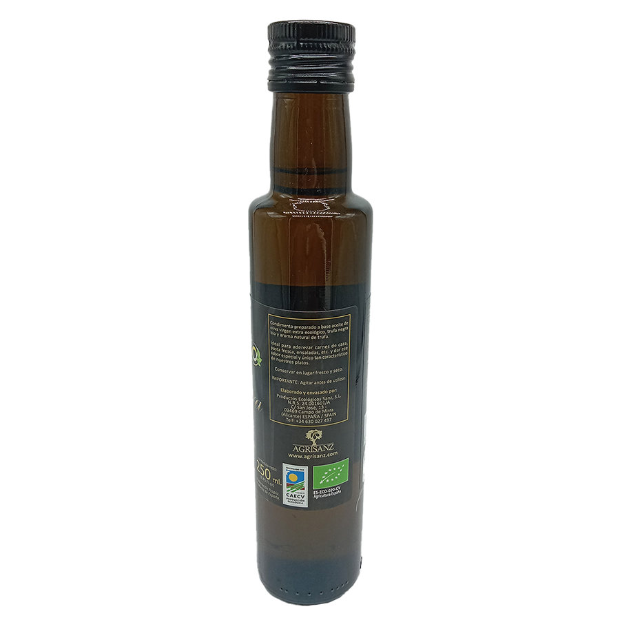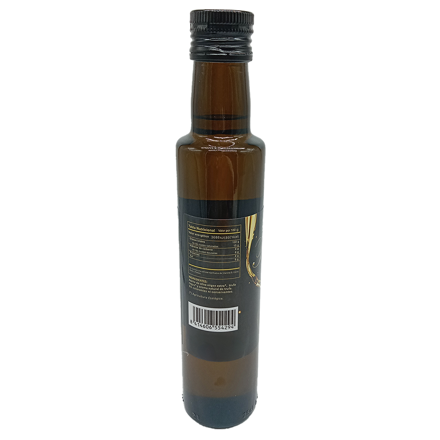 Elaborado a partir de aceite de oliva virgen extra ecológico y aroma natural de trufa negra, aporta un sabor intenso, elegante y muy característico, asociado a la alta cocina.