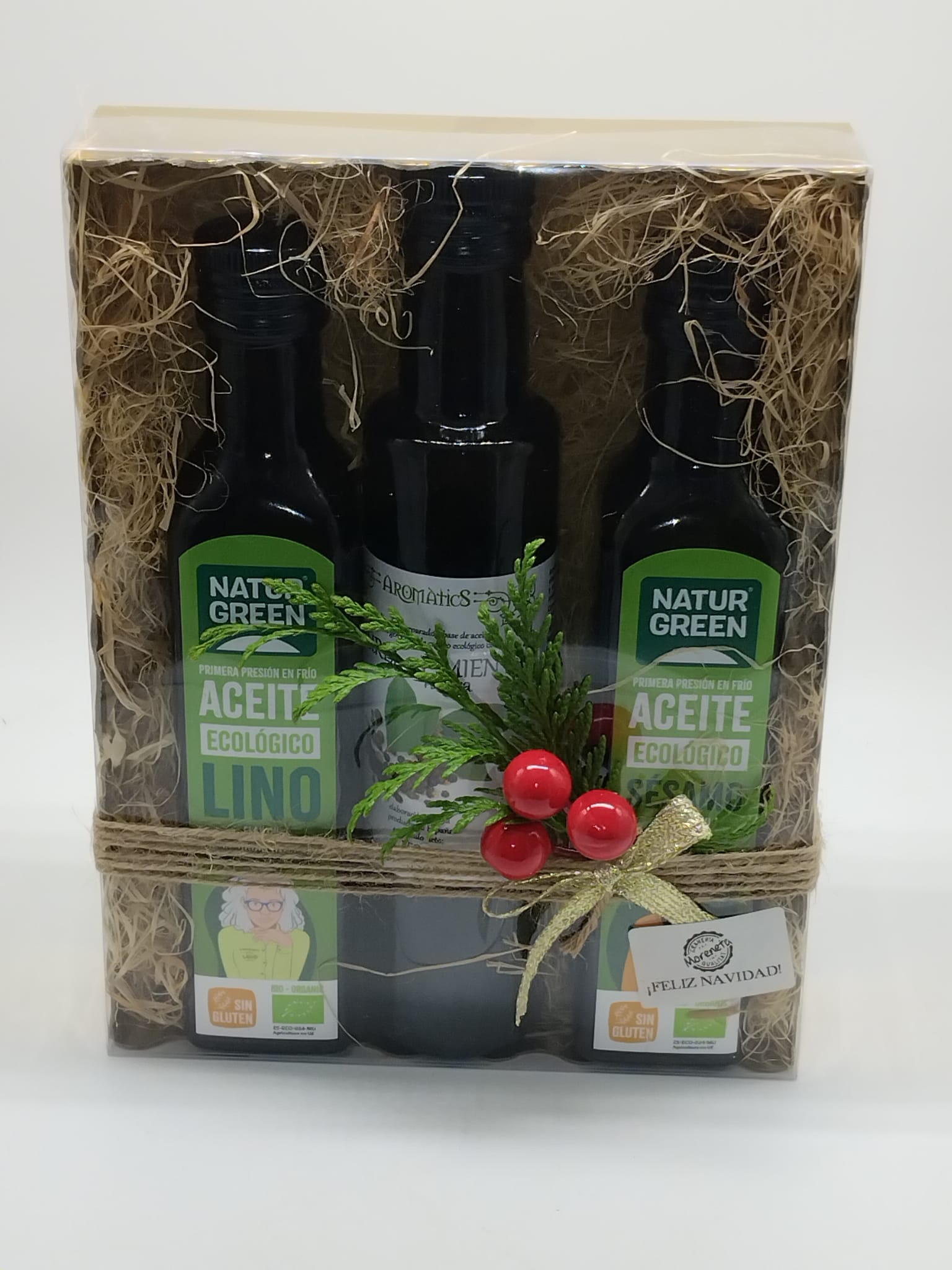 La Cesta de Regalo de Navidad. Un detalle navideño lleno de sabor y salud. Incluye tres aceites ecológicos de primera presión en frío —lino, sésamo y oliva aromatizado con pimienta y laurel. Seleccionados por su calidad nutricional y su valor real en una alimentación saludable. Perfecto para regalar y listo para disfrutar en estas fiestas.